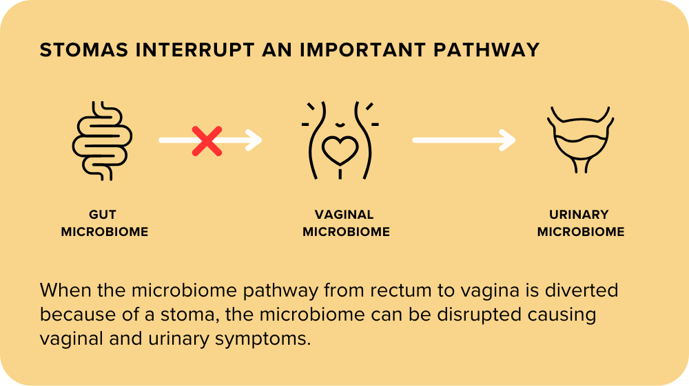 The natural bacterial exchange between these three microbiomes becomes interrupted after a stoma is created. If you experience frequent UTIs, thrush or vaginal irritation after an ileostomy or colostomy and find that oral supplementation of probiotics does not help any more, try a local application of probiotics. The direct route seems to work more effectively in this situation.